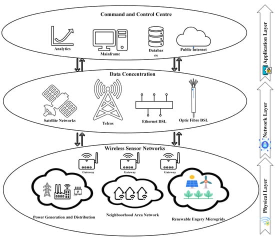 Complementary to these advancements, smart grids are transformative for smart cities, optimizing energy usage in real time and pre-empting potential problems [2]. Smart grids are an essential national asset for any country, playing a crucial role in modernizing energy infrastructure. Traditional power grids comprise power generation, transformation, transmission, and distribution. Smart grids incorporate diverse power equipment and may incorporate IoT devices that sense humidity, temperature, immersion, vibration, current leakage, and record video data. Pointed IoT equipment may enable implementation of intelligent power systems [3,4,5]. These IoT devices establish wireless device-to-device (D2D) communication at the physical layer [6]. Each network has a gateway for data concentration which constitutes the network layer, and the control station serves the application layer of IoT in smart grids. While smart grids offer immense benefits to smart cities, they also present significant security challenges. A substantial review was conducted by Alsuwian et al. [7] concerning cybersecurity threats in IoT of smart grids. These networks in smart grids operate at the intersection of the physical layer, network layer, and application layer, making them susceptible to cyber threats at multiple levels. Therefore, their security at all levels is paramount. The interconnected nature of smart grids entails that vulnerability at one layer may cascade across the entire system, potentially leading to widespread disruptions.