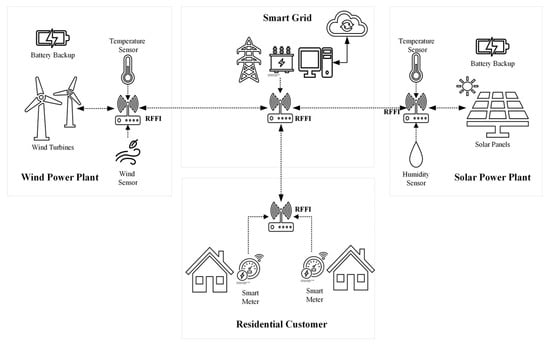 The layered architecture in IoT of smart grids is illustrated in Figure 5 [55]. At the physical layer, data from sensors, actuators, and smart meters are collected at the gateways. At the network layer, data from multiple gateways are concentrated and relayed to the application layer operating on servers in the control center using legacy communication methods. The goal of cybersecurity in IoT is to ensure protection at every layer; the same is applicable in smart grids as well. A closer look at the threat spectrum being faced by smart grids underscores the importance of device authentication [56,57], although physical layer intrusion detection systems have the capacity to perform device authentication at the first stage of defense in wireless networks [58]. But, to this end, there has not been a study on the implementation of physical layer security measures in wireless communication between IoT devices of smart grids for authentication. To fill this gap, RFF emerges as a potential solution and this article builds the case for discussion on the associated deployment aspects in smart grids.
