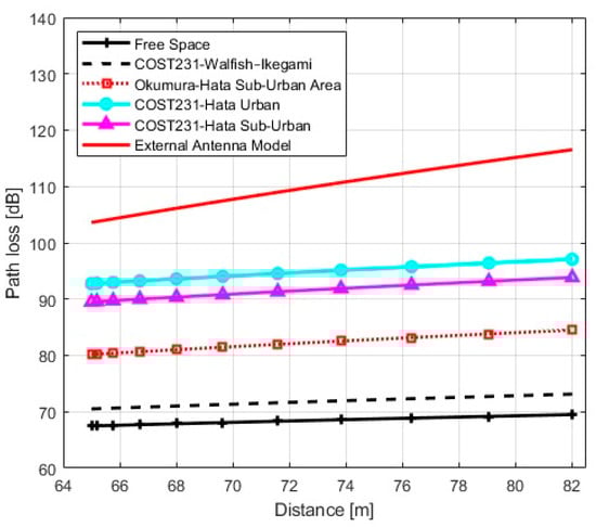 Before a technology is deemed suitable for practical deployment, it is important to estimate its performance considering real-world conditions. The aim of presenting a typical DL-aided RFF system in Section 3 was to highlight the hurdles in achieving the desired outcome. The key performance indicator (KPI) of an RFF system is its classification accuracy. There has not been a study on the estimation of this KPI in a smart grid use case. However, the authors’ previous work in [19] covered the performance comparison of various ML-aided classifiers with different SNR values of the received signal. Table 1 summarizes the experimental results from that study. The results show decent performance even in low SNR conditions. Given that the IoT devices in wireless sensor networks of smart grids are deployed in a static setting, empirical propagation measurements in urban environments may serve as a good reference for RSSI estimation [68]. Figure 7 provides a path loss curve in decibels (dB) against the distance between communicating nodes. Using the locations of smart meters, sensors, and IoT gateways, the expected RSSI could be estimated at the RFF receiver.