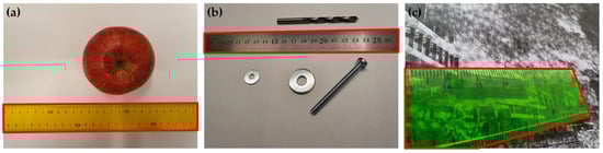 Illustrated motivation and challenges in ruler detection within images. Rulers, commonly employed as measurement standards, are presented amidst various objects being measured utilizing computer vision (a,b). The presented three cases (a–c) have varying degrees of perspective distortions in images that complicate accurate ruler localization.