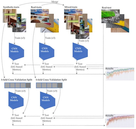 To address these questions, three training configurations were used: training using a synthetic image dataset (referred to as “synthetic-train” dataset), training using a dataset composed of real images (denoted “real-train”), and training using a mixed dataset containing both synthetic and real images. CNN-based ruler detection algorithms were then developed using these datasets. The performance of these detectors was subsequently compared by employing a real image test set (“real-test”), alongside a selected performance metric. The overall block diagram of the experiment is depicted in Figure 3.