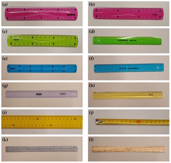 The real ruler datasets included a wide range of rulers, ensuring diversity in color, material, and gradation markings (Figure 4). The images capture these rulers against a multitude of simple and complex backgrounds, simulating a spectrum of real-world scenarios. The rulers were photographed under diverse lighting conditions to test the algorithm’s resilience to illumination variations. Additionally, the rulers and camera were positioned at different orientations and angles to ensure that the algorithm could recognize rulers irrespective of geometric (perspective) distortions and rulers’ alignment in an image. To further mimic real-world conditions, there were images with partial rulers—rulers cropped by the camera frame. When collecting images for the training dataset, the ruler was moved after each shot to ensure there was no relationship between the background pattern and the ruler position. A representative subset of images of real rulers from the training/test sets are shown in Figure A1.