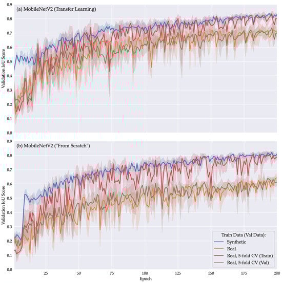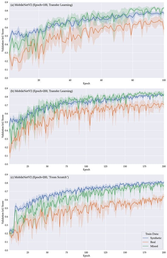 The number of training epochs was determined empirically based on initial experiments aimed at balancing computational efficiency and achieving near convergence in the validation curves. For transfer learning applications, a duration of 100 epochs was set, while models trained from scratch were trained for 200 epochs to facilitate comprehensive learning. All experiments used epochs of 500 steps and a batch size of 64.