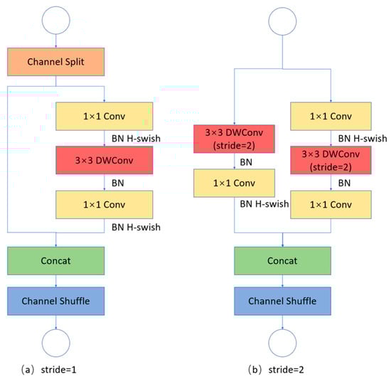 The ShuffleNetv2 network comprises two types of blocks: the pointwise convolution block and the depthwise separable convolution block. The pointwise convolution block handles dimension reduction and expansion using a 1 × 1 convolution, while the depthwise separable convolution block is responsible for feature extraction and integration. Furthermore, ShuffleNetv2 introduces a special operation known as Channel Shuffle, which rearranges the channels in the feature map to enhance feature interaction.