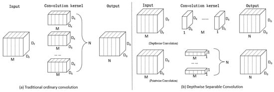 32] is a specific type of convolutional operation. The depthwise separable convolution block consists of a 3 × 3 depthwise convolution followed by a 1 × 1 pointwise convolution. Its primary purpose is to reduce the number of parameters and the computational complexity of the model while preserving effective feature extraction capabilities.