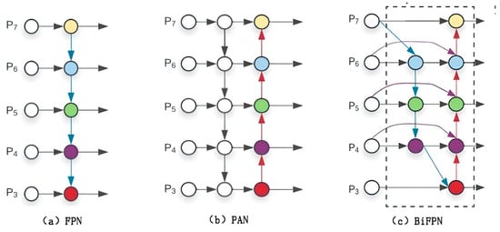 16] (Feature Pyramid Network + Path Aggregation Network), BiFPN utilizes both top-down and bottom-up paths as a single feature network layer and iteratively repeats the process to achieve higher-level feature fusion. This design effectively enhances the model’s detection capability for objects of different scales, improving the precision and robustness of object detection.