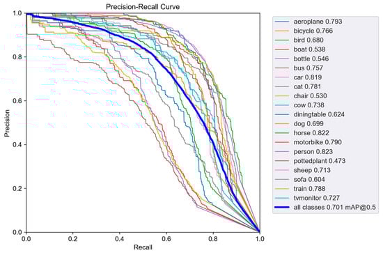 Figure 8 displays the P-R (precision–recall) curve of DB-YOLO on the VOC2007+2012 dataset. On the P-R curve, the larger the AUC (area under the curve) for a class, the higher its mAP50.
