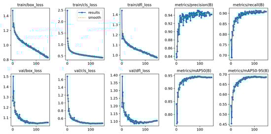 Here, TP represents the number of true positive detections, FP represents the number of false positive predictions, FN represents the number of false negatives, AP represents the average precision for each class, and mAP represents the mean average precision across all classes; “mAP50” represents the mAP when the IOU (Intersection Over Union) threshold is 50% and “mAP50:90” represents mAP when the IOU threshold varies from 50% to 90%. In object detection tasks, IOU thresholds are commonly used to measure the overlap between the predicted and the real bounding boxes. A threshold of 50% indicates that a predicted bounding box is considered correct if its overlap with the real bounding box exceeds 50%.