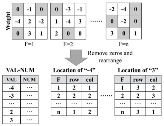 According to the characteristics of the hardware calculation, the computation of the weight matrix () and input matrix () can be preprocessed. We defined as the transformed filter matrix: