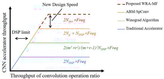 Second, the parallelism of convolution and the critical path of accelerators are limited by DSPs. Because the DSP is a fixed IP provided by the vendor, its critical path cannot be shortened further by modifying the design. If the DSP usage can be reduced or removed, this can increase the parallelism of the convolution operation and improve the convolution frequency. Assuming that the convolution operations have exhausted all the DSP resources, Figure 2 roughly estimates the computational roof of the aforementioned convolutional acceleration approach, where NDSP denotes the number of DSP blocks, and Freq denotes the clock frequency of the accelerators. denotes the input and output taps of the convolution operations for a Winograd-based accelerator. Ng denotes the number of elements that share the same DSP block in ABM-SpConv. Table 1 indicates that the Winograd algorithm and ABM-SpConv reduce the imbalance utilization between the logic and DSP blocks, but they do not eliminate the phenomenon completely. Therefore, the parallelism of the existing accelerated design is still limited by the number of DSP blocks, and the frequency is limited by the critical path of the DSP blocks. NAcc denotes the number of accumulators of the proposed WRA-MF. Because the proposed WRA-MF does not use DSPs, it can maximize the parallelism of the convolution operation. Furthermore, the frequency of the convolution operation is determined by the critical path of the accumulator. Through structural design, we can shorten the critical path of the accumulator through pipeline design to improve the convolution frequency.