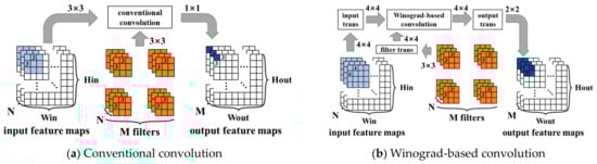 The Winograd algorithm is a fast convolution algorithm primarily used in deep learning, particularly in CNNs, to speed up the convolution operation. Figure 3 compares conventional convolution with Winograd-based convolution. Assuming there are input feature maps and output feature maps, the filters consist of groups, each group consisting of convolutional kernels. The Winograd algorithm transforms convolution operations into elementwise multiplication operations by transforming the input feature maps, filters, and output feature maps through fixed transformation matrices. The Winograd algorithm for computing outputs with an -tap FIR filter, which is called , has been known since at least 1980. By nesting the minimal 1-D Winograd and , the minimal 2-D Winograd algorithm for computing outputs with an filter can be realized, which is called . As the size increases, the three transform matrices become increasingly complex until the acceleration capability is lower than the transform cost. Generally, the most commonly used sizes are and . Larger sizes have too much transform overhead, and their constants are not , which is not conducive to hardware implementation.