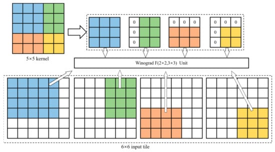 The hardware architecture of the convolution operation consists of a fixed form of a multiplier array and an adder array. Therefore, a convolution operation unit cannot be compatible with two or more operations of different sizes. For most CNN calculations, accelerators need multiple convolution operation units to match convolution kernels of different sizes; otherwise, the accelerators will not work. This study used a convolution computation architecture employing a stride-based convolution decomposition method (SCDM) [24] to make up for the shortage of MF-Conv, which makes the convolution unit more compatible. In the SCDM, kernels with different sizes are decomposed or filled to the shape of 3 × 3. Specifically, when the kernel size is less than 3, the kernel should be filled into 3 × 3 with zeros. When the kernel size is larger than 3 and the stride (s) is equal to 1, the kernel is decomposed into several 3 × 3 kernels. For example, a 5 × 5 kernel was decomposed into one 3 × 3 block, two 2 × 3 blocks, and one 2 × 2 block, as shown in Figure 4. The 2 × 3 block and 2 × 2 block were filled into 3 × 3 blocks via padding with zeros. When the stride (s) is equal to 1, it gathers neighboring elements into a decomposed kernel. When the stride (s) is equal to 2, instead of gathering neighboring elements into a decomposed kernel, the elements with two step distances both in the vertical and horizontal directions are gathered. When s = n, the elements with distances of n steps in both the vertical and horizontal directions are gathered together. Thus, the proposed convolution unit not only improves the underutilized logic resources but also normalizes the convolution operations. Therefore, the unified Winograd algorithm of can be used to achieve convolution operations with different kernel sizes and strides (s).