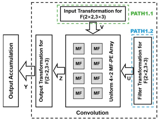 Figure 5 shows the overview of the convolution scheme of the proposed WRA-MF, including the computation module of , the input transformation matrix unit, the filter transformation matrix unit, and the output transformation matrix unit, which completes the calculation task of Equation (8). PATH1.1 and PATH1.2 read the data from the input buffer and filter buffer and then transform the data in the transformation matrix unit to obtain the transformed input pixel (V) and the transformed weight (U), respectively. Based on the Winograd algorithm, PATH1.1 and PATH1.2 simultaneously start and send data (V and U) to the computation module. The computation module contains eight MF-PEs, which calculate the elements in matrix (). These elements are sent to the output transformation unit to obtain the output element in matrix (). The input transformation unit and the filter transformation unit can accomplish the computation by sharing transformation logic [24], thereby involving little hardware overhead.