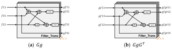 The filter transform unit is composed of 3 + 4 Filter_Trans arrays. The filter transformation architecture of the Filter_Trans arrays is shown in Figure 6. Each Filter_Trans array contains three addition operations, two shift operations, and one negation operation. The symbol is used to represent the elements of the filter matrix (). The calculation process of this transform unit includes the following two steps. First, it uses three Filter_Trans arrays to calculate the multiplication of matrix () and matrix () (i.e., in Equation (3)), which generates the intermediate result of the conversion module, as shown in Figure 6a. Then, the matrix () is obtained by using four Filter_Trans arrays to calculate the intermediate result and matrix () multiplication, as shown in Figure 6b.