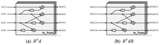 The input transform unit is composed of 4 + 4 In_Trans arrays. The input transformation architecture of the In_Trans arrays is shown in Figure 7. Each In_Trans array contains four addition operations and two negation operations.