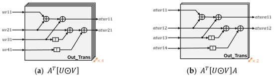The output transform unit is composed of 4 + 2 Out_Trans arrays. The output transformation architecture of the Out_Trans arrays is shown in Figure 8. Each Out_Trans array contains four addition operations and two negation operations. The processes of the latter two transformations are similar to that of the first one.