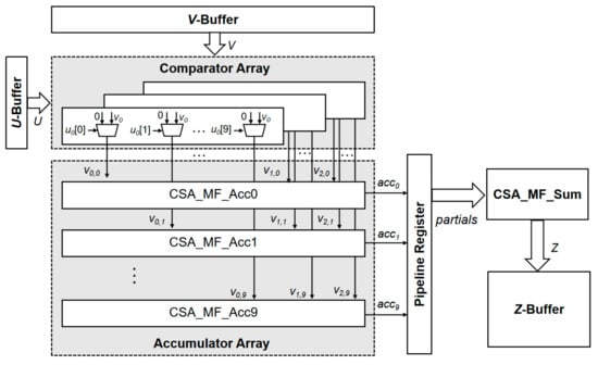An MF-PE contains three comparator arrays, each with an input (u) element. A comparator array contains ten one-bit comparators to judge whether each bit of the element has a value of 1. Through the comparator, the determines whether the can be transmitted to the accumulator array. If the current bit of the is 0, then no action is taken. If the current bit of the is 1, then the position of the comparator is used as the label, and then the corresponding is assigned to and sent to the accumulator corresponding to the label. The function of a comparator array is shown in the pseudo-code of Table 3.