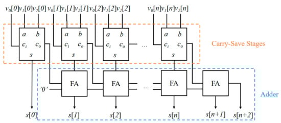 The MF-PE unit performs the accumulation of several elements, which determines the path delay convolution operations. The accumulator in the MF-PE performs the addition operation of three elements. The carry-save adder (CSA) has a minimal carry propagation delay when it performs the addition of several elements. The key to the CSA is to calculate and save the carry () and sum (s) separately, as shown in Equations (26) and (28):