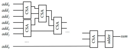 The sum function unit in the MF-PE performs the addition operations of ten elements. Figure 11 shows the overall architecture of the sum function unit, which contains multi-level CSA units. A CSA unit represents a carry-save stage. Here, is the -th element participating in the calculation.
