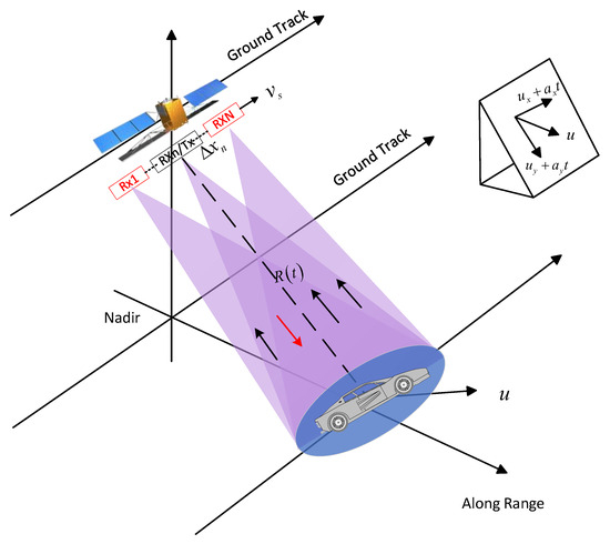 Moving targets are different from stationary targets because they have additional motion relative to the radar platform. From Figure 1, the slant distance between the satellite launch center and the moving target can be expressed as: