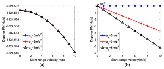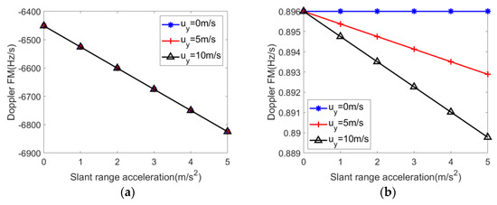 Figure 2 illustrates the effect of slant range acceleration on the second-order and higher-order parameters of the Doppler frequency modulation. Figure 2a shows that Doppler frequency modulation is very sensitive to slant range acceleration, with the frequency modulation changing by 100 Hz/s for every 1 m/s2 change in slant range acceleration. Figure 3 illustrates the impact of slant range velocity on second-order and third-order Doppler frequency modulation parameters. Figure 3a shows that the slant range velocity does not change the Doppler frequency modulation under the influence of slant range acceleration. Comparing Equations (11) and (12), the Doppler third-order frequency has , so the influence of is greater than . However, compared with the influence of the second-order frequency modulation parameter , the influence of can be ignored.