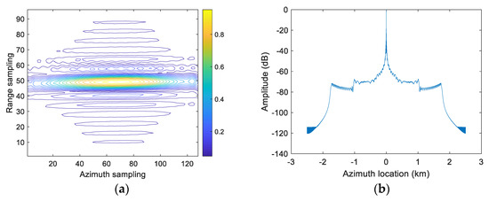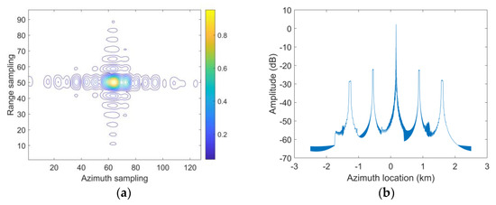 After the conventional multichannel reconstruction approach is processed, the results of capturing point target images with different moving velocities, as shown in Figure 4 and Figure 5. Figure 4a,b show the interpolated contour plots and the maximum azimuth profile of a point target with an along-track velocity of 10 m/s and an along-track acceleration of 5 m/s2, which causes image defocus. The amplitude of false targets caused by along-track acceleration is small or even negligible. Figure 5a,b represent a moving target traveling at a slant range velocity of 10 m/s and a slant range acceleration of 5 m/s2. There are obvious false targets in the imaging results. To address this phenomenon, this paper proposes an azimuthal multichannel reconstruction method.