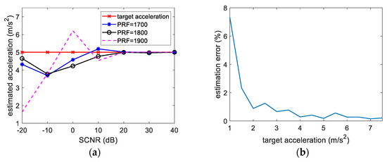 Acceleration estimation error under different conditions. (a) Fixed PRF value and different SCNR; (b) same SCNR and PRF value.