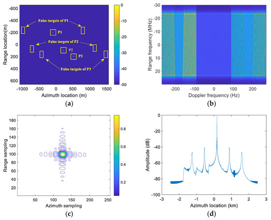 Point target imaging results with slant range velocity and acceleration. (a) Point target focusing results; (b) two-dimensional spectrum; (c) contour of P2; (d) peak profile of azimuth.