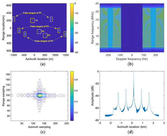 In the matrix, each row corresponds to a reconstruction filter of each channel, which is composed of N filters. That filter partitions the whole frequency band into N sub-bands and the center frequency of each sub-band is . Then, combining echoes from all azimuthal receiving channels, a clear spectrum of imaging for the moving targets can be gained. Finally, the equivalent single-channel raw data are obtained by inverse azimuth Fast Fourier transform.