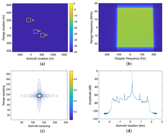 Imaging with improved methods. (a) Point target focusing results; (b) two-dimensional spectrum; (c) contour of P2; (d) peak profile of azimuth.