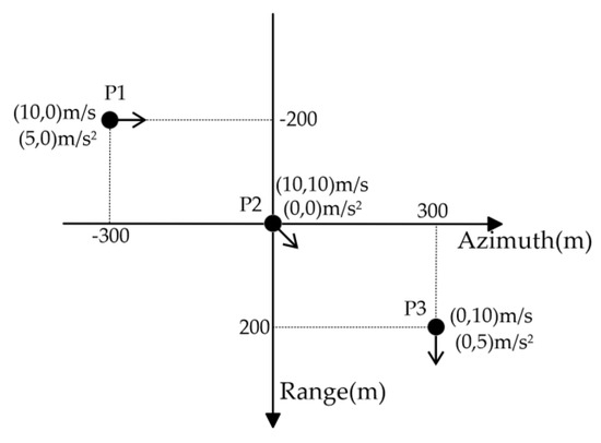 In addition, for the completeness of the paper, a simulation experiment with three-point targets in the same scene was designed; the corresponding geometric relationship of three-point targets is illustrated in Figure 13. All point targets have different movement velocities. This provides additional evidence to support the feasibility of the proposed method. Target P1 has an along-track velocity of 10 m/s and an along-track acceleration of 5 m/s2 (Figure 13). Target P2 has an along-track velocity of 10 m/s and a slant range velocity of 10 m/s. Target P3 has a slant range velocity of 10 m/s and a slant range acceleration of 5 m/s2. When the conventional azimuth multichannel reconstruction method is used, as seen in Figure 14a, there is no change at point P1, indicating that along-track acceleration has no effect on imaging. The point target P3 is significantly out of focus and contains obvious false targets. After using the proposed azimuth multichannel reconstruction method the three-point targets can be effectively focused and false targets are obviously suppressed, as observed in Figure 14b.