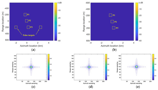 Imaging results of three-point targets. (a) Conventional azimuth multichannel imaging. (b) Proposed azimuth multichannel reconstruction. (c) Contour of P1. (d) Contour of P2. (e) Contour of P3.