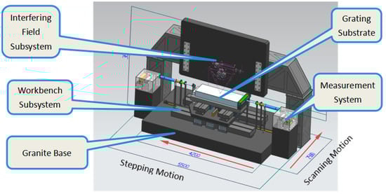 The SBIL system includes an interference field exposure system and a stage motion system, as shown in Figure 1. The stage motion system consists of an X-direction positioning system and a Y-direction scanning system. The X-direction positioning system is used to support the Y-direction scanning system and grating substrate, with a total weight of 1600 kg. During the scanning exposure process, the X-direction positioning system carries the Y-direction stage and the grating substrate in one direction, and the Y-direction scanning system implements the reciprocal motion. The grating’s scribed lines are created by superimposing interference fringes generated via multiple reciprocal motions.
