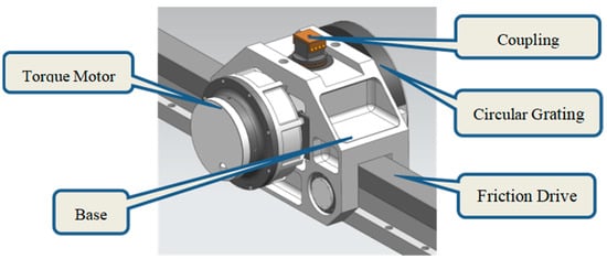 The macro-positioning system adopts a friction-drive method, with the structure shown in Figure 2. The main components include a drive motor, a circular grating, a base coupling, and a drive shaft system. The stroke of the macro-positioning part can reach 1800 mm. To reduce the steady-state vibration of the motor during the stabilization process, a harmonic reducer with a reduction ratio of 160 is between the motor and the tube grating.