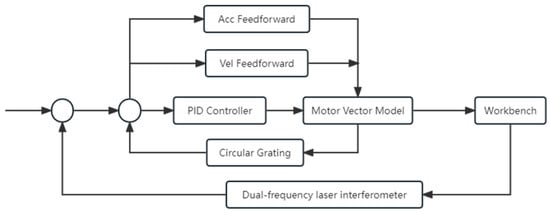 The control structure of the macro-positioning system after the PMSM adopts the vector control is shown in Figure 3. The control method of the macro-positioning system is a combination of semi-closed and fully closed loop control. During the system motion, the circular grating data are used for position feedback during the PMSM motion, and the position correction is achieved using the data of the dual-frequency laser interferometer. In addition, this system adds speed feedforward and acceleration feedforward to the traditional PID control, improving the system response.