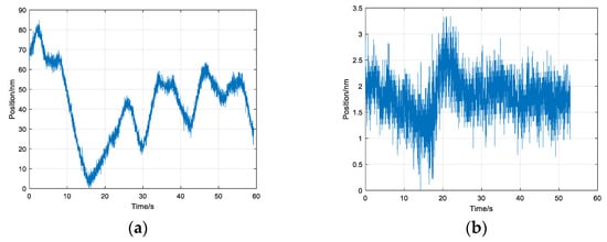 First, we compared the noise of the interferometer with and without the optical path-sealing mechanism. Turn off the air flotation of the macro-positioning system and record the data of the dual frequency laser interferometer when using the optical path sealing mechanism and when not using the optical path sealing mechanism. The results show that when the optical path was open, significant fluctuations occurred in the position data measured with the interferometer. Meanwhile, this fluctuation was significantly improved when the optical path-sealing mechanism was used.