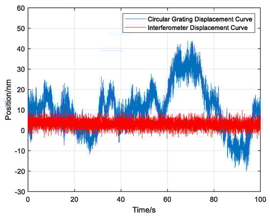 Next, we included the optical path-sealing mechanism, ventilating the air-bearing table, enabling the friction drive motor. We measured the static stability of the table using an interferometer, and we calculated the displacement data equivalent to the angle of the circular grating, as is shown in Figure 11.