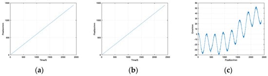 We run the positioning system at a speed of 1 mm/s in the positive direction to a position of 1400 mm, and record the angle value of the circular grating and interferometer data, as shown in Figure 12a–c.