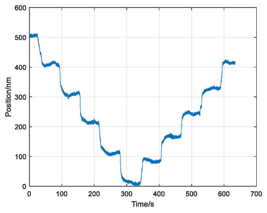 One advantage of a friction drive compared with other drives is its lack of backlash during motion, allowing for a higher step resolution. To test the stepping ability of the macro-positioning system, we conducted a bidirectional step experiment in the positioning system, causing the friction drive to move in the positive direction for 100 nm in the open-loop mode for five steps and then move in the opposite direction for five steps. The position data of the dual frequency laser interferometer during the movement are recorded as shown in Figure 13.
