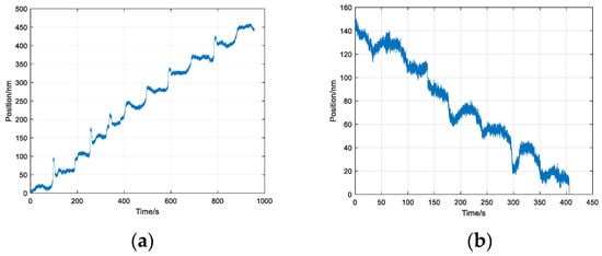 When the macro-positioning system performed the 100 nm movements, it produced a clear staircase curve. Figure 13 shows that the backlash of the feed system was approximately 30 nm. Figure 14a,b depict curves representing the feed mechanism of the workbench when performing unidirectional step motions of 50 nm and 20 nm. A clear staircase shape is again present when stepping at 50 nm. However, when stepping at 20 nm, the macro-motion mechanism could not produce the staircase behavior. Therefore, the feed capacity of the macro-motion mechanism is superior to 50 nm, sufficient to meet the adjustment requirements of the micro-motion mechanism. Also, we know that the maximum feed capacity of the macro-positioning system is less than 20 nm, which also has certain significance for a system with a load-bearing capacity of 1600 kg.