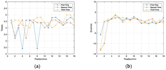 The scanning exposure mode of the scanning interference field exposure system is simulated, and a step motion at a 2 mm/s speed for a distance of 100 mm is performed until reaching the 1800 mm position. After waiting for each step to complete, a dual-frequency laser interferometer is used to record the displacement data of the positioning system for 10 s at a time interval of 20 ms. This process is repeated three times, and the adjustment time is recorded, as shown in Figure 17.