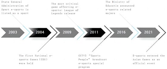 The evolution of esports in China can be traced back to the late 1990s and has encompassed several distinct development stages: exploration (1998–2008), development (2009–2013), maturity (2013–2016), and continued development (2017–present) [24]. Figure 4 provides a visual representation of the important events characterizing each of these stages in Chinese esports.