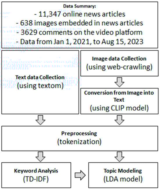The diagram in Figure 5 shows the overall process and programs that were used in each step. Initially, the data were collected through web crawling and Textom to gather 11,347 online news articles along with 638 embedded images. For the conversion of the data into a numerical format suitable for computer-based analysis, the images underwent textualization through the Contrastive Language–Image Pretraining (CLIP) Library (ViT-B/32 model). Next, natural language processing techniques were employed for data preprocessing in order to filter out extraneous words and to enhance data quality. Then, frequency and TF/IDF (Term Frequency–Inverse Document Frequency) were analyzed to extract 20 keywords from the dataset. Following keyword extraction, topic modeling utilizing the LDA algorithm was constructed. To identify the optimal topic model, a performance evaluation was conducted, and finally, the outcomes of the final topic model were effectively visualized to facilitate interpretation and insights.