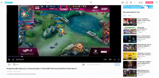 The primary keyword used for data collection was ‘esports’ and the data sources are described in Table 1. The data collection timeframe spanned from 1 January 2021, which coincided with the inclusion of esports as an official sport in the Asian Games, to 15 August 2023. In total, 11,374 news articles and 638 images were collected. Following the preprocessing steps, the corpus data were refined to consist of 551,172 words for articles and 2484 words. As for the viewer comments, a total of 3629 comments from 972 video clips from Bilibili as shown in Figure 6 were selected and analyzed, resulting in 48,920 words. Among these, 2783 were unique words, without repetition. Established in 2009, Bilibili is a versatile cultural content live broadcasting platform that encompasses a wide range of entertainment genres including music, dance, movies, and digital games. Users are allowed to post their comments directly onto video content, so it gained great popularity for its engaging and interactive viewing experience. Bilibili served as the primary platform for the live broadcast of the Hangzhou esports games [26].