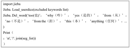 Preprocessing is a crucial step aimed at refining the data for analysis by eliminating irrelevant elements, including special characters and numerical values [25]. In this study, keywords that were considered extraneous for analytical purposes, such as specific names, locations, and countries, were systematically excluded from the dataset. For instance, as shown in Figure 7, terms like ‘是’ (yes), ‘不是’ (no), ‘能’ (can), ‘不能’ (can’t), and ‘你我他她它’ (you, me, he, she, it) were identified and subsequently removed during the preprocessing stage.