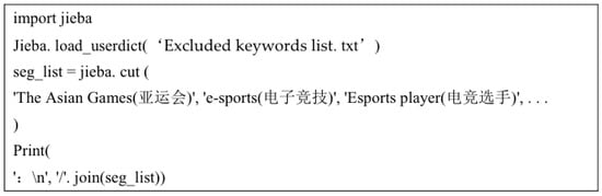 Keywords that held significance but cannot be extracted conventionally were treated differently and cataloged in a dedicated user dictionary. For instance, as depicted in Figure 8, the terms ‘electronic (电子)’ and ‘sports (竞技)’ exist as separate words in Chinese, but when combined, they form ‘e-sports (电子竞技)’. Thus, ‘e-sports’ was amalgamated into a single word and incorporated into the user dictionary.