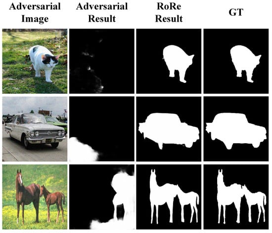 Figure 7 shows the precision–recall curves for different datasets and target models. For benign images, the curve with RoRe is very close to the original benign curve, indicating that RoRe does not significantly compromise the accuracy of benign images. For adversarial images, the curve with RoRe is still somewhat distant from the benign curve, but compared to the adversarial curve, there is a substantial improvement.