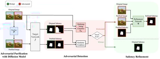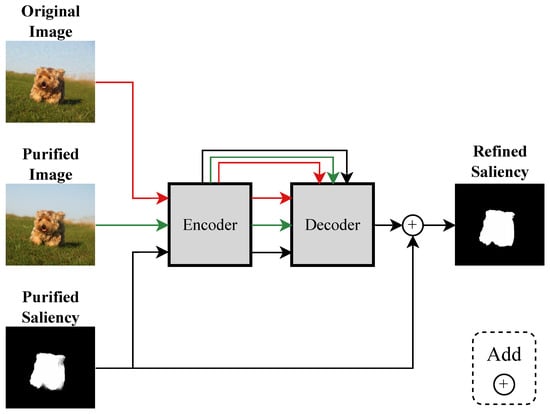 Saliency refinement aims to further enhance the accuracy of the generated coarse salient results, including tasks such as sharpening edges, removing background noise, and preserving the integrity of foreground images. We categorize these methods into two groups: non-neural network and neural network methods. (1) Non-neural network methods refer to approaches that do not rely on neural networks but instead design heuristic algorithms to refine salient results. Xu et al. [21] conducted a statistical multiscale local analysis. Wang et al. [22] conducted feature contrast manipulation between the foreground and background. The spatial structure is considered to preserve local structural integrity [23] or remove background noise [24,25]. (2) Neural network methods involve training a network model to achieve refinement. Xu et al. [26,27] modified the CRF to cascade for handling multiscale saliency results. In terms of feature learning, image features [28,29], color and texture features [30], complementary and discriminative features [31], as well as motion energy and appearance features [32] are learned to improve the coarse results. In terms of network architecture, the local superpixel-based CNN [33], fully convolutional network augmented with segmentation hypotheses [34], and the residual refinement block functioning as an internal module within the network [35] all represent viable approaches. The process from coarse to fine depends on how the coarse results are produced. In this paper, ‘coarse’ refers to the prediction results of the purified image. Due to the minor distortions in the purified image compared to the original, the prediction results are already close to those of the benign image. Therefore, this paper adopts a residual structure in the encoder–decoder-based network, training it for refinement. It is a straightforward and effective method.