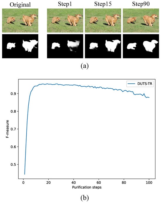 The influence of purification steps. (a) Purification results using different steps. Choosing an appropriate value for , the number of steps, is crucial. If is too small, noise removal is inadequate, resulting in incorrect saliency results. If is too large, the image information deviates from the original, also leading to incorrect results. (b) Purification steps vs. F-measure. Dataset is DUTS-TR [36].