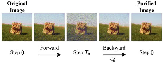 Adversarial purification with diffusion model. The original image undergoes a forward diffusion process, followed by a backward denoising process.